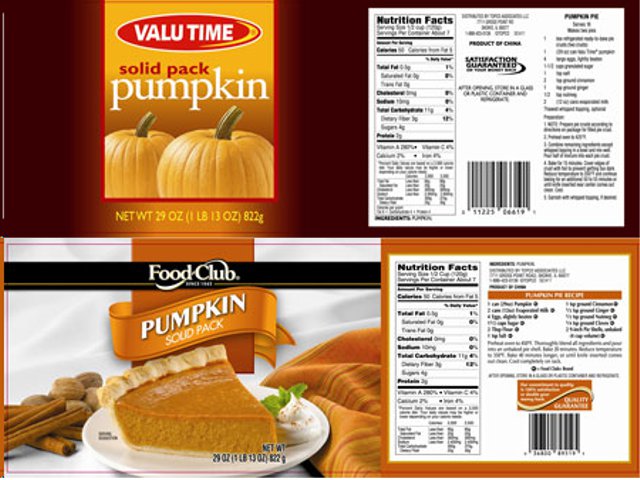 The affected canned pumpkin is sold under different brands: the Valu Time brand and Food Club brand. The affected Valu Time canned pumpkin was sold beginning August 30, while the affected Food Club canned pumpkin was sold beginning October 28. Both of these brands were made by Topco Associates, LLC. Giant Eagle has found that the affected products did not meet standards of quality that could have an effect on consumer safety.
